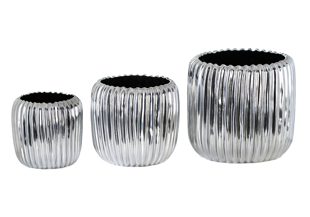 Kvetináč Mechanic má vrúbkovaný povrch a lesklú striebornú glazúru, ktorá pôsobí, akoby bol kovový, hoci sa jedná o keramiku.