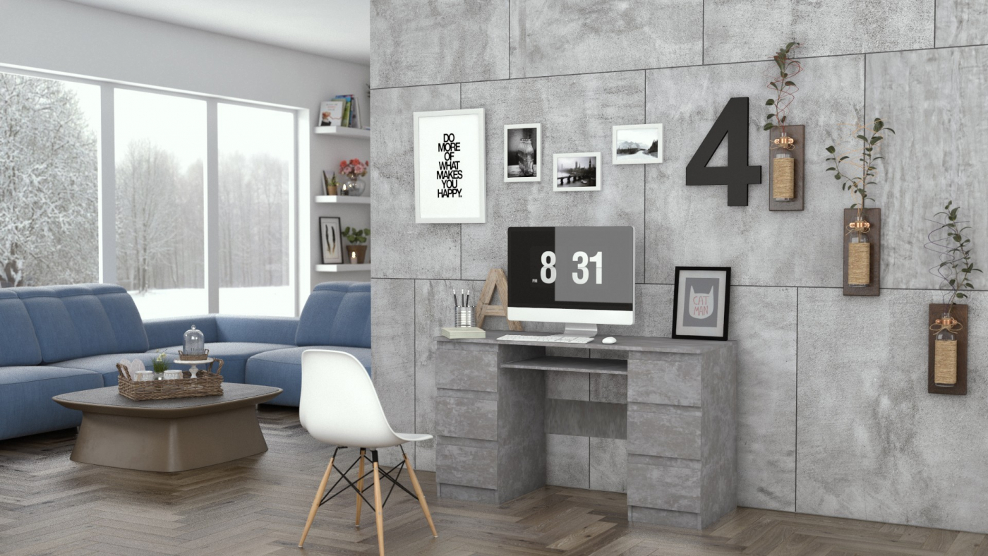 Pracovný stôl so zásuvkami Kuba je celý v dekore tmavý betón a predstavuje dizajnové riešenie pre každého, kto hľadá spôsob, ako si štýlovo zariadiť pracovné prostredie. Písací stôl Kuba disponuje hneď šiestimi zásuvkami, do ktorých sa vám zmestí všetko potrebné. Praktický bonus stola je výsuvná polica pre klávesnicu.