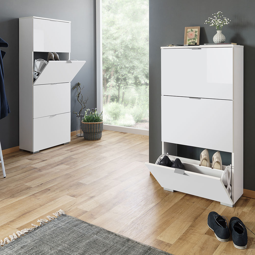 Botník s 4 výklopnými zásuvkami Wien je celý biely, ale čelá zásuviek sú lesklé.