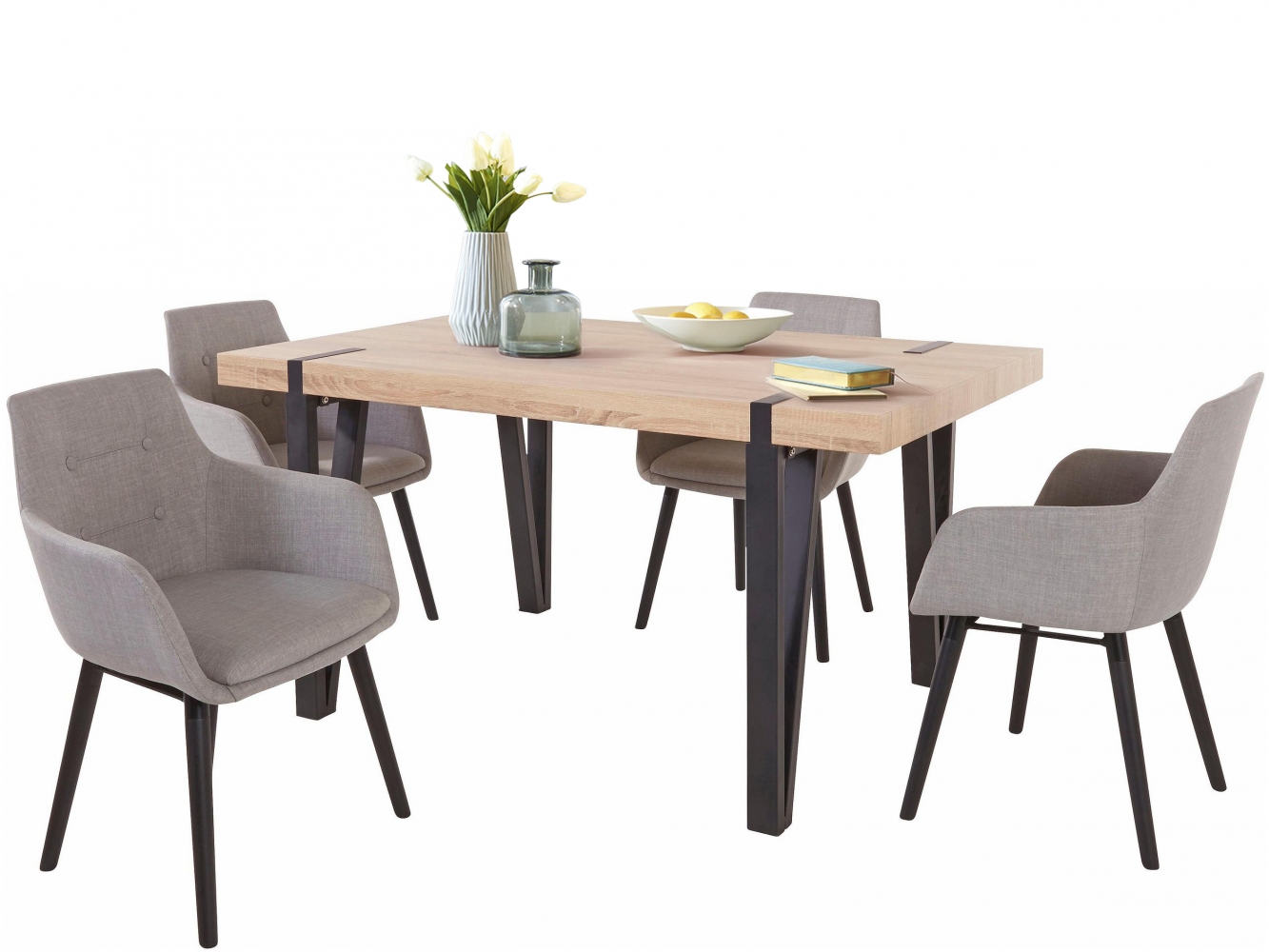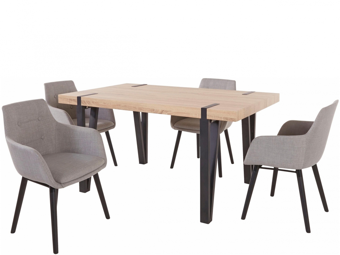 Extravagantná jedálenská súprava Shely v modernom vyhotovení vám ponúka stôl, ktorý je vyrobený z kvalitného dreva s dizajnovou kovovou podnožou čiernej farby. Ďalej k stolu patria štyri stoličky. Stoličky sú z tkaniny s pohodlným podsedákom a podnož je z kovu čiernej farby.
