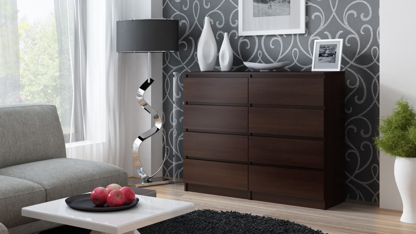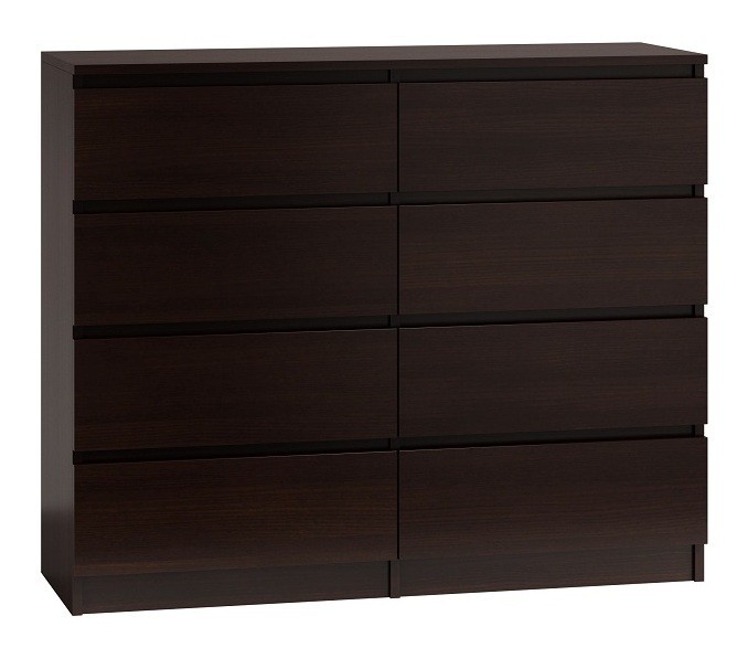 Moderní komoda Malwa si najde své místo především v moderních ložnicích, dětských, ale i obývacích pokojích. Elegantní tmavě hnědá barva zaujme již na první pohled. Komoda disponuje praktickým úložným prostorem v podobě 8 zásuvek.