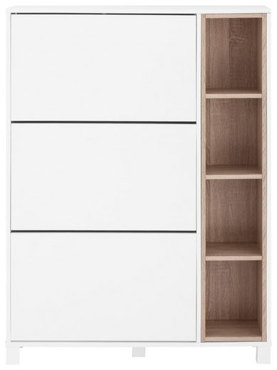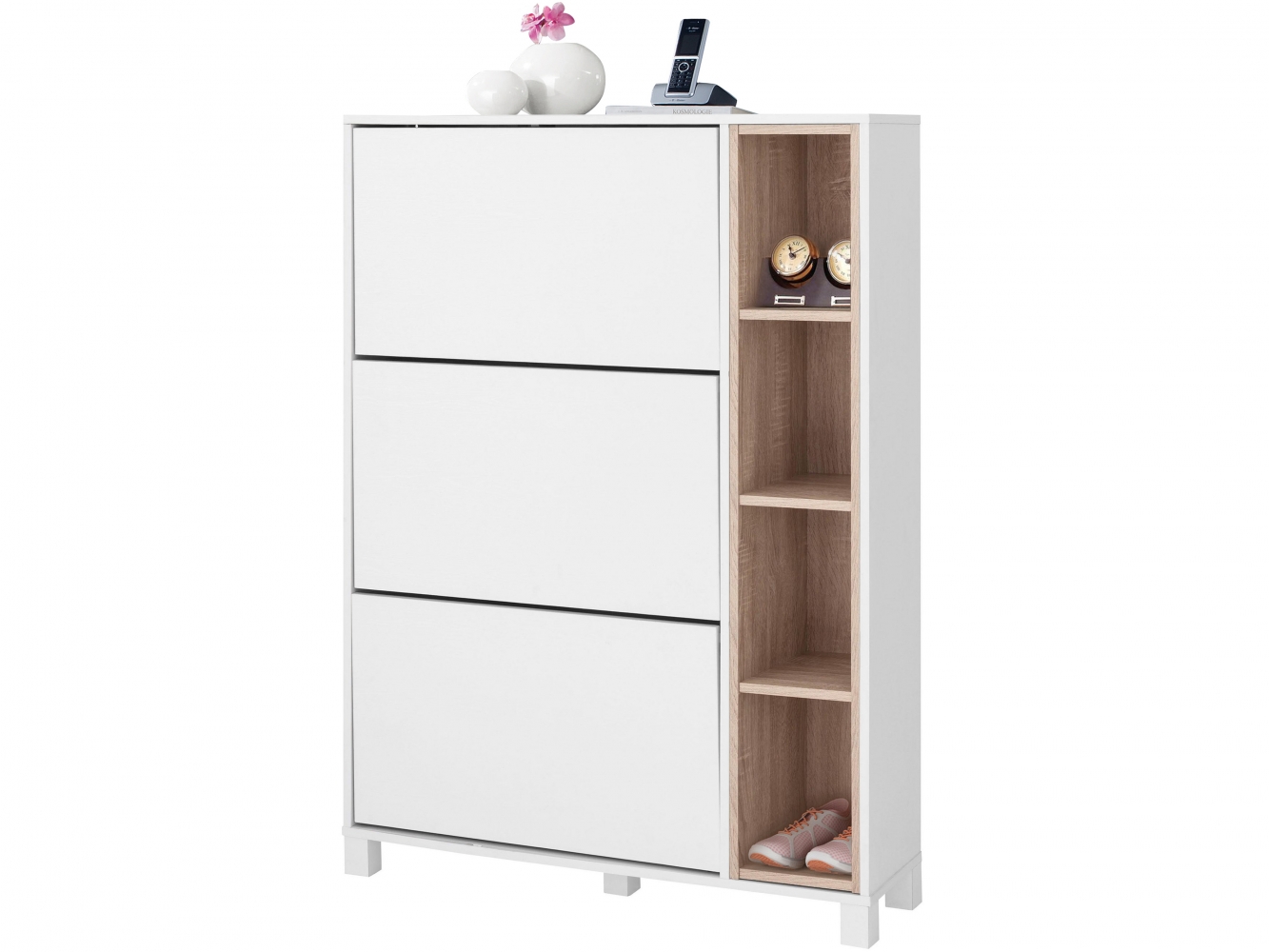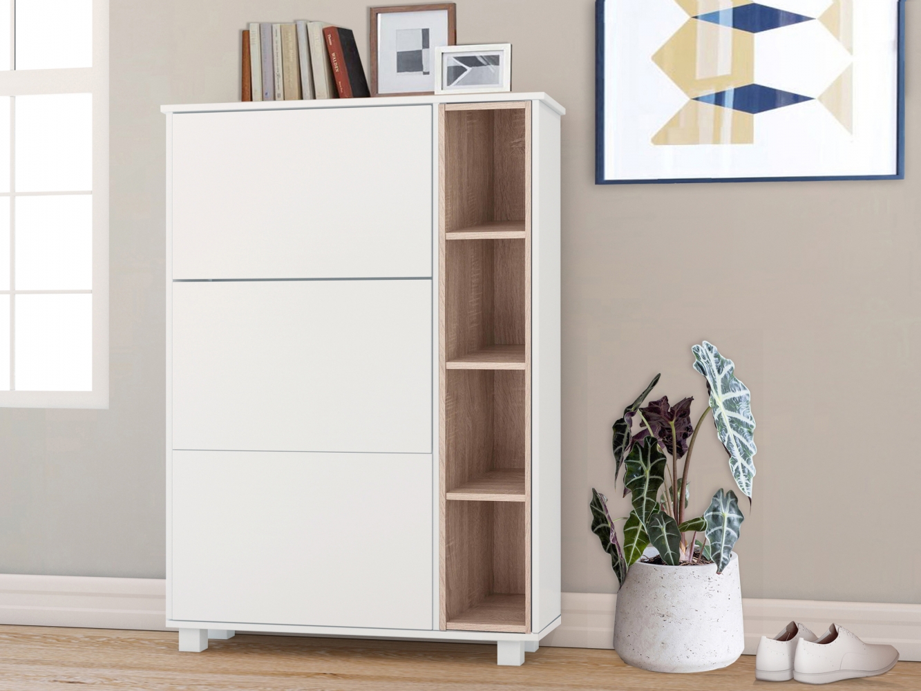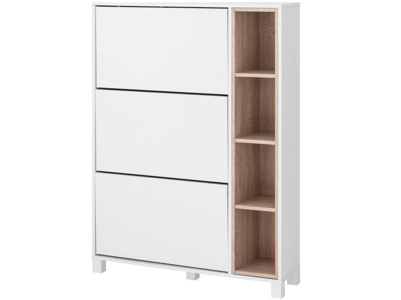 Moderná skrinka na topánky Paker vám zaručí pohodlné uloženie vašej obuvi. Elegantný a jednoduchý štýl dodáva produktu naozajstný šmrnc, ktorý skvele doplní predsieň či chodbu. Skrinka sa skladá z troch vyklápacích políc a štyroch otvorených políc. Vyrobená je z MDF v bielej farbe a dekóre duba.